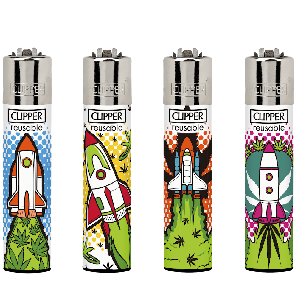 Blast off to the Ganja-verse with the Astro Weed 3 - Clipper lighters collection! An interstellar fusion of cosmic art and classic canna-culture. Featuring bright, eye-catching designs of four canna-shuttle launches, against a white background surrounded by colourful dots, flaming leaves and green smoke.