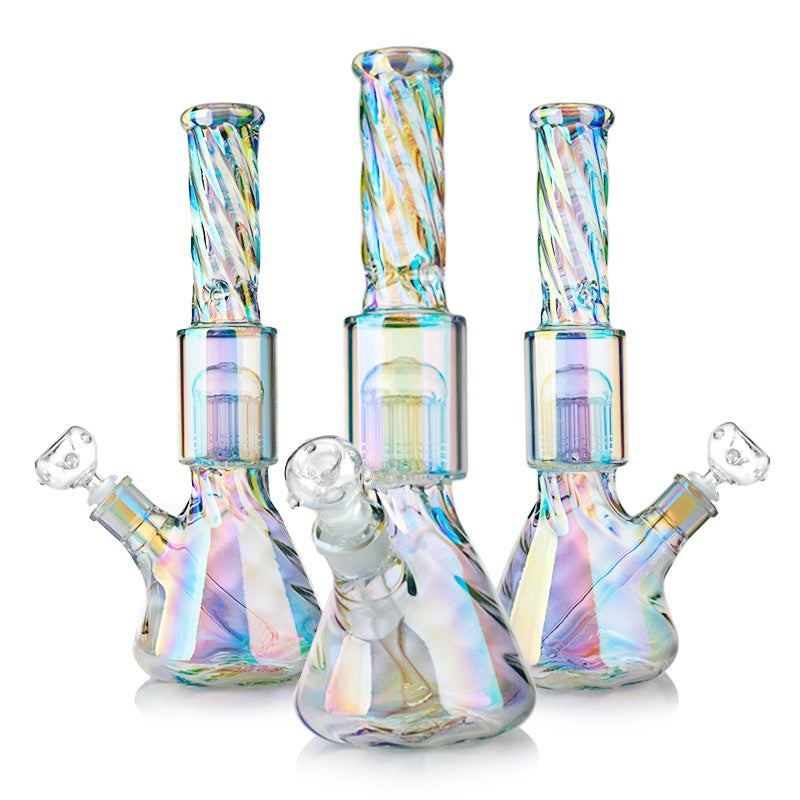 Make rainbows around the rest with this 35cm Twisted Rainbow Percolator waterpipe bong. Feautring heavy duty iridescent glass, a sturdy beaker base with a twisted glass inlay, cooling chamber with twelve arm tree percolator, ice pinch and a contoured twisted neck that not only completes the look, also adds some extra grip!