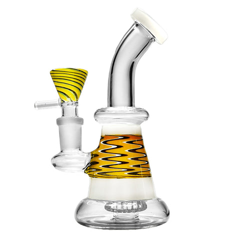 Give it a whirl with these swirly 'Zig Zag' 15cm Glass Mini Percolator bongs! Fully functional for herbs and dab adaptable due to the angle of the funky striped bowl with handle, these mini waterpipes feature an angled neck for ease of use, water chamber and a showerhead percolator that helps the smoke bubble through water for a smoother experience.